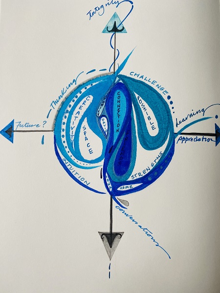 Centrally, the words show my connection to David, my family, my friends, and the Island of Iona (maternal heritage). Without these people and places, I would be adrift. They are at the heart of my compass. The other words inside and outside the circle, describe what I think I do with my leadership and how I engage others, on my and their own leadership journey.